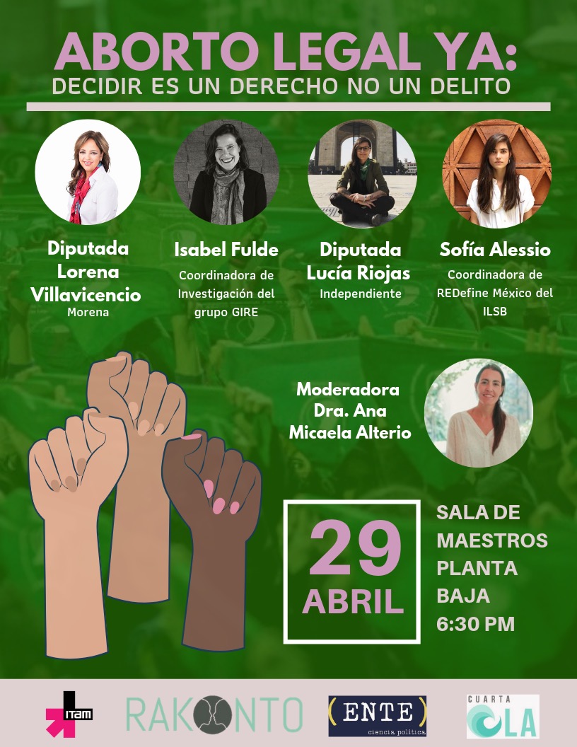 La representación de Relaciones Intenacionales, Rakonto, la representación de Ciencia Política, Ente y las organizaciones estudiantiles Cuarta Ola y HeforShe ITAM extienden una cordial invitación al panel "Aborto legal ya: Decidir es un derecho, no un delito" moderada por la Dra. Ana Micaela Alterio. Contaremos con la participación de la Dip. Lorena Villavicencio (Morena), Isabel Fulde (grupo GIRE), la Dip. Lucía Rojas (independiente) y Sofía Alessio (ILSB).