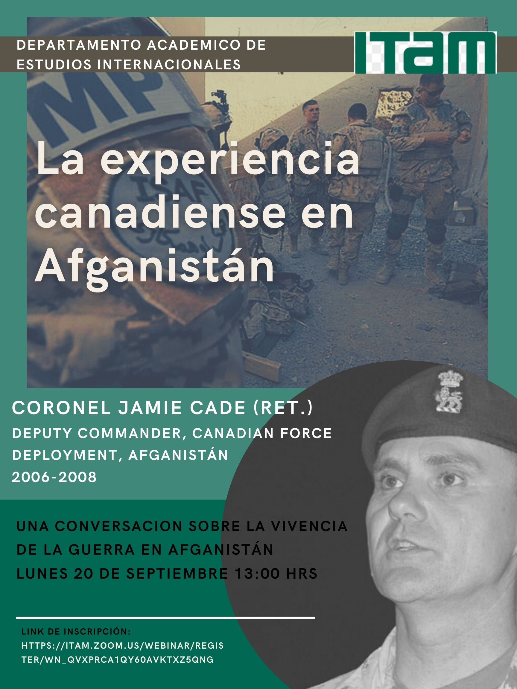 Invitación a participar en el conversatorio sobre “La experiencia canadiense en Afganistán, una conversación sobre la vivencia de la guerra en Afganistán”, con el ponente invitado Cnel. en retiro Jamie Cade, Comandante adjunto, despliegue de la Fuerza Canadiense en Afganistán durante 2006-2008.