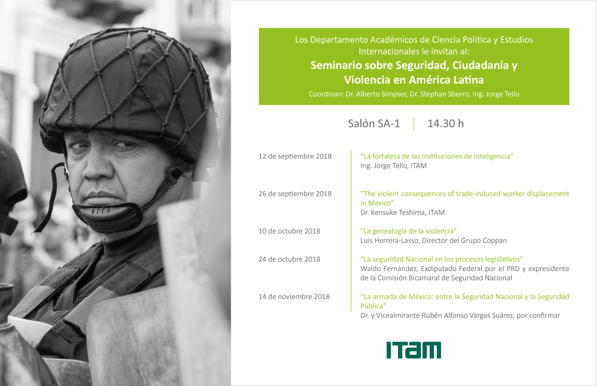 Se les hace una cordial invitación al Seminario sobre seguridad, ciudadanía y violencia que organizan los Departamentos Académicos de Ciencia Política y Estudios Internacionales, y el Centro de Estudios sobre Seguridad, Inteligencia y Gobernanza del ITAM.